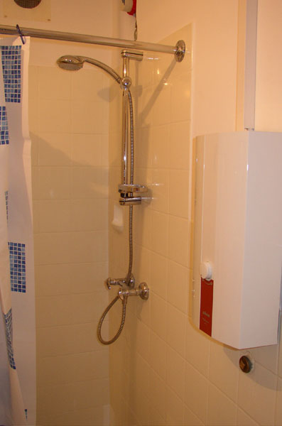 Rechts der praktische Elektro-Durchlauferhitzer für Warmwasser im Badezimmer - er gehört zum variablen Inventar. Bei der Dusche gehört die Armatur und die Brause ebenfalls zum geliehenen variablen Inventar.